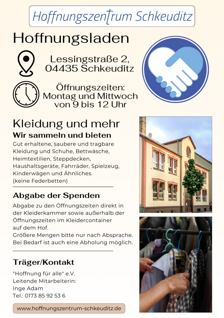 Die Kleiderkammer hat geöffnet! Kommen Sie gerne vorbei, um Sachen abzugeben oder zu stöbern. Montag und Mittwoch 9.00-12.00 Uhr